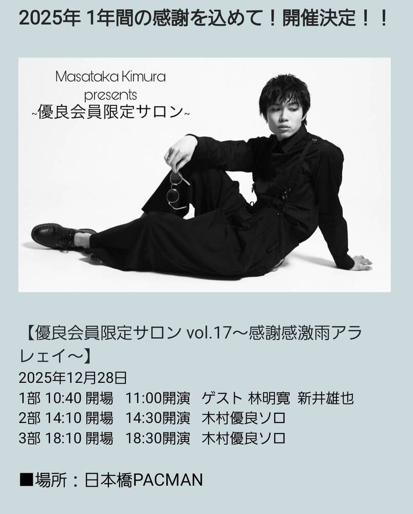 木村優良イベント「優サロン vol.17~感謝感激雨アラレェイ~」 ゲスト出演 SCHEDULE 2025/12/28(日) 日本橋PACMAN 地図を表示 木村優良さんの「優サロン vol.17~感謝感激雨アラレェイ~」 第1部にゲスト出演します! 2025年12月28日(日) 会場:日本橋PACMAN 東京都中央区日本橋本石町4丁目5−5 藤ビル 地下1階 1部 10:40 開場 11:00開演 ※チケット販売詳細は後日発表 URLをコピーする 報告する